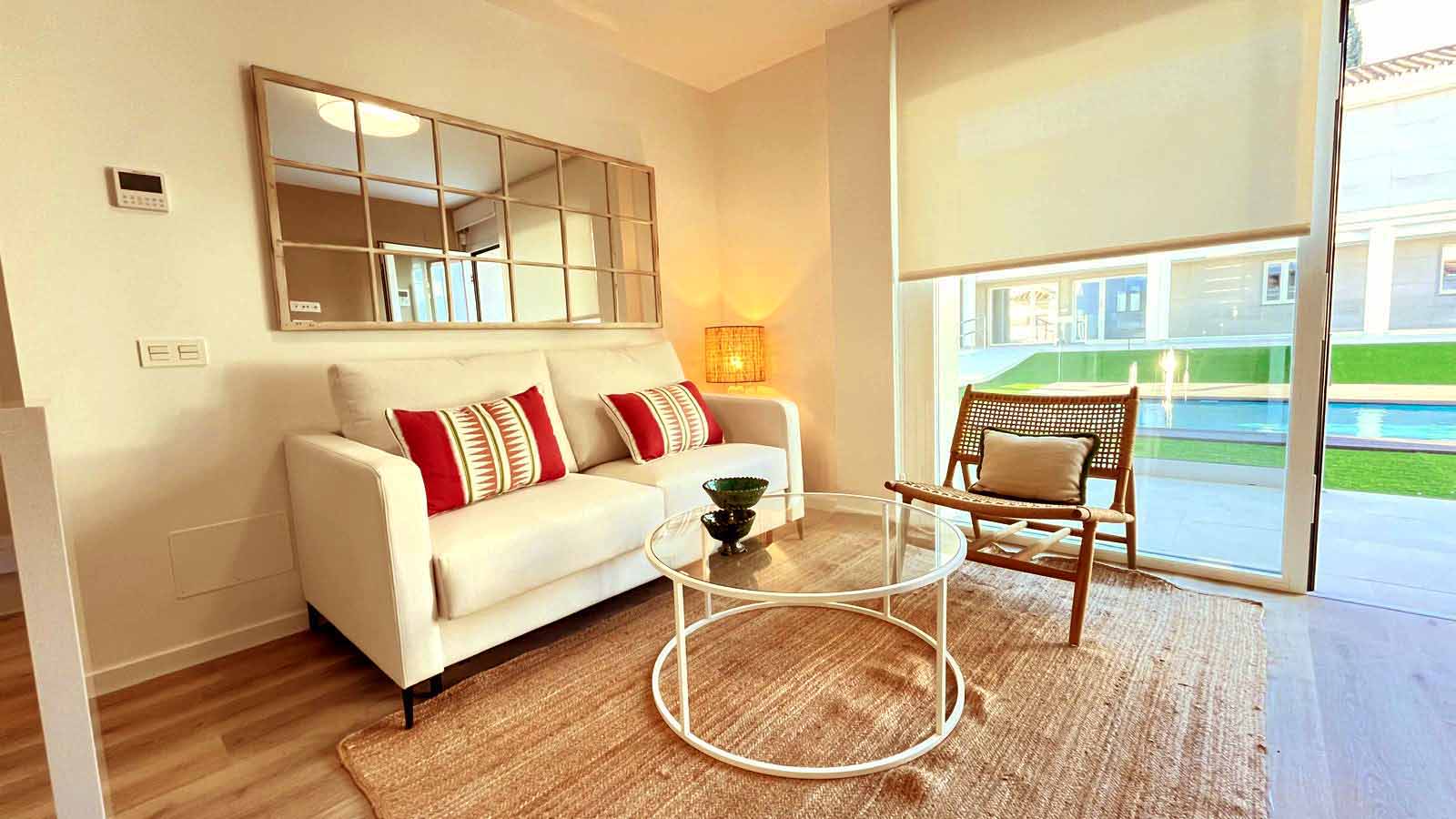 Diez apartamentos están situados en planta baja, con acceso directo a un acogedor porche privado con vistas a la piscina y a los jardines comunitarios.